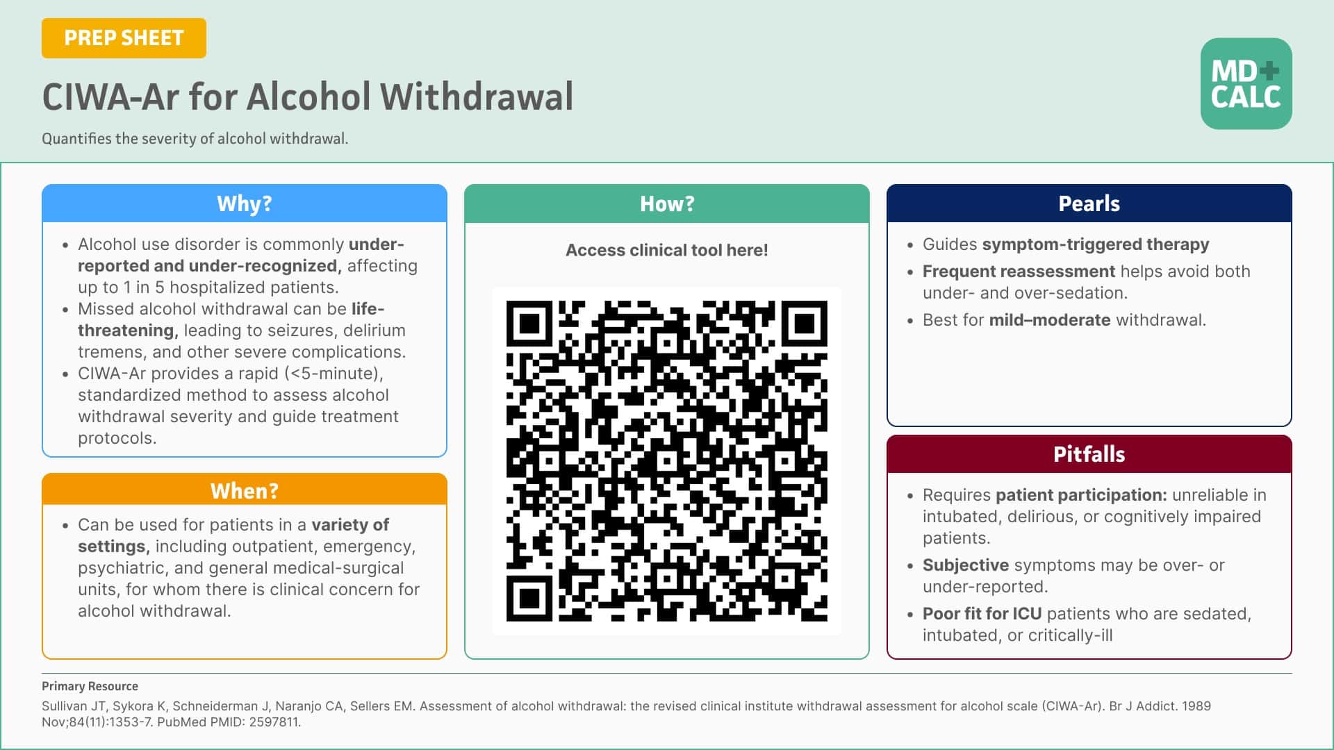 - 🏥 In severe/ICU withdrawal, CIWA-Ar breaks down — intubation, delirium, sedation, or critical illnessmake symptom reporting unreliable.
