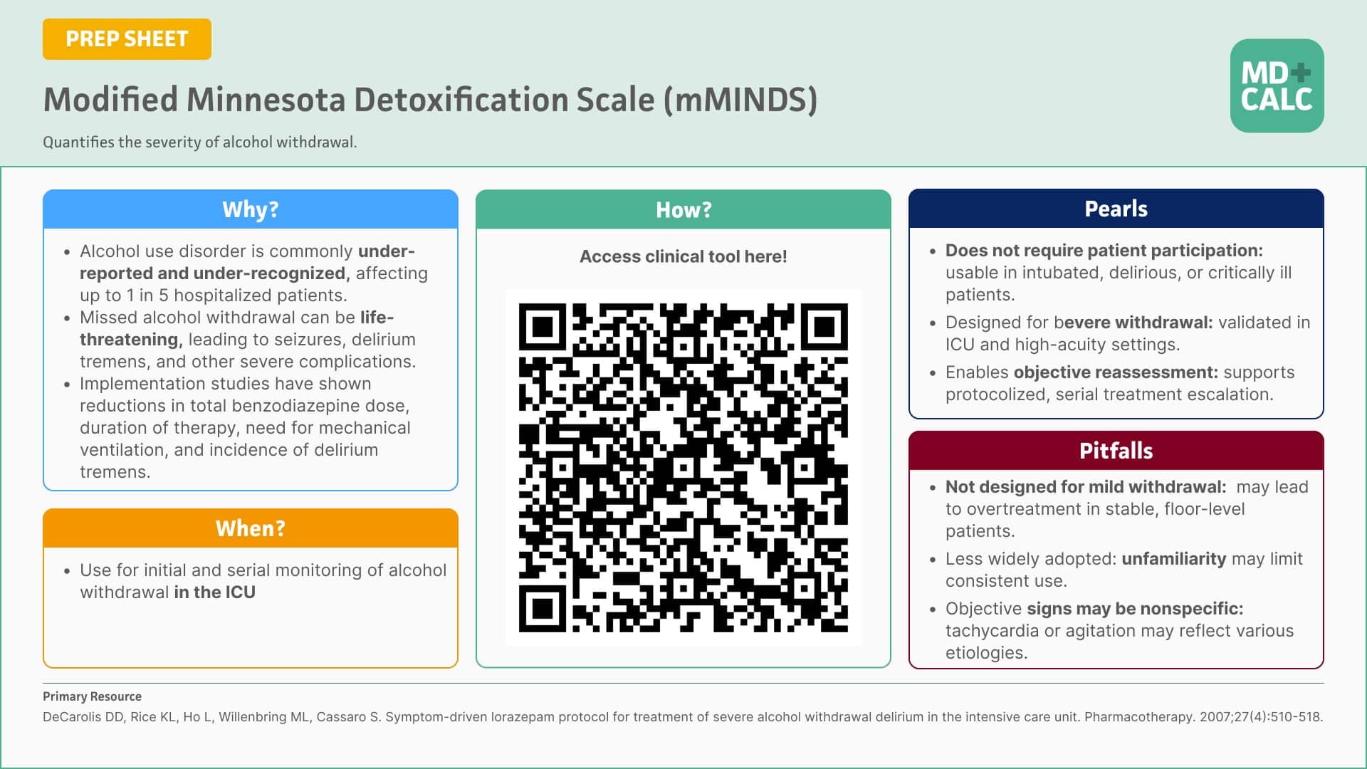 CIWA-Ar includes multiple elements that require a patient to answer subjective questions (e.g., anxiety, nausea, hallucinations) and communicate reliably. In intubation, delirium, psychosis, or severe critical illness, those inputs become impossible or unreliable, so CIWA-Ar can’t be completed accurately and may mislead care. - When should I use mMINDS instead of CIWA-Ar?