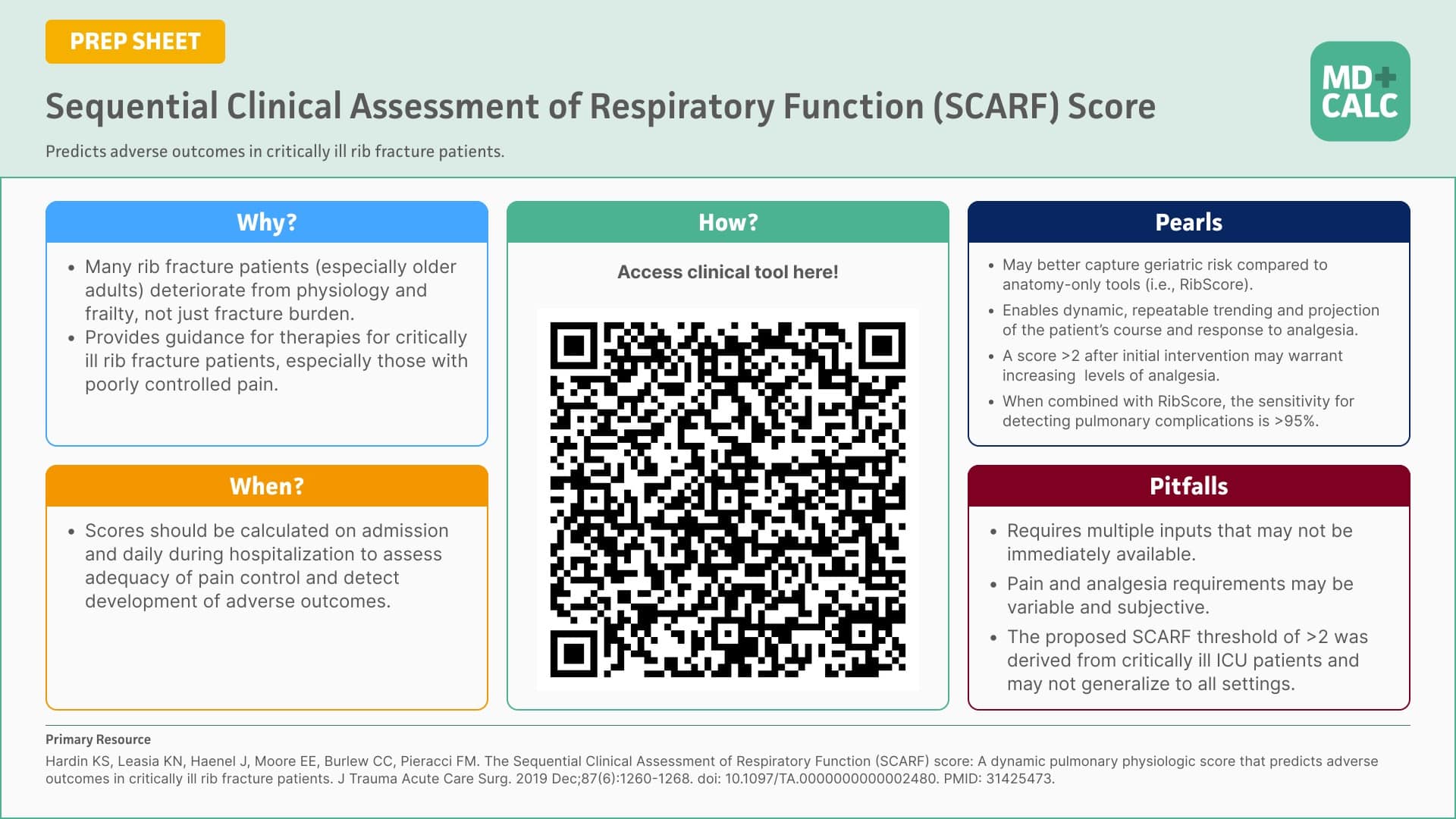 - SCARF Score: Physiology-based. Best for identifying patients with rib fractures who may warrant escalation of analgesia and/or level of care (e.g., stepdown, ICU).